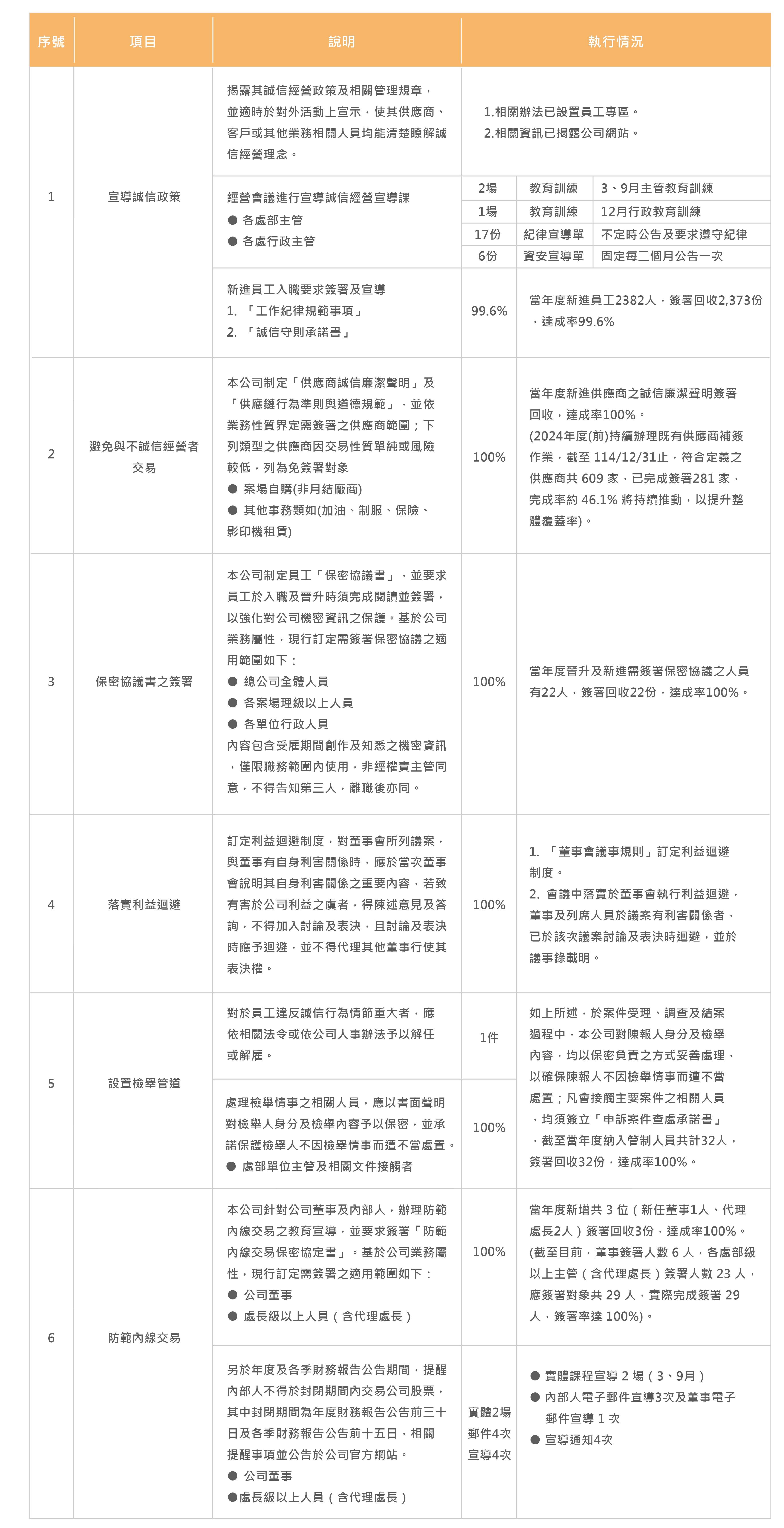為建立誠信經營之企業文化及落實誠信經營管理,本公司秉持廉潔、透明及負責之經營態度,並訂定相關管理辦法以作為誠信經營遵循之政策,以規範本公司所有利害關係人有關誠信行為之標準,杜絕公司有不誠信情事發生,同時所有員工在執行公司業務時必須廉能公正及遵守政府法令及規定,相關辦法皆存放於本公司員工專區。