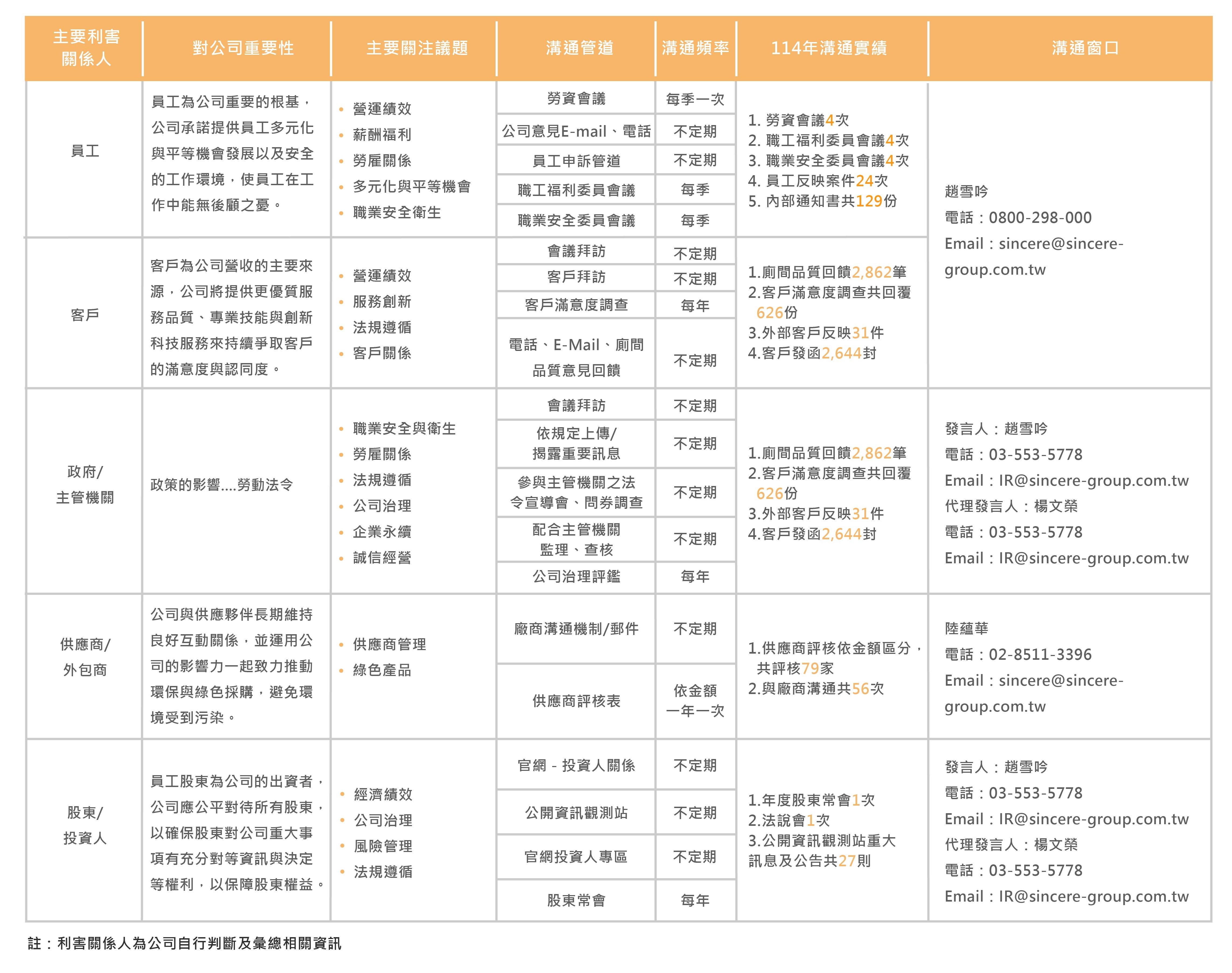 利害關係人關注議題、溝通管道及最近一年溝通實績,113年溝通實績,已提報114年12月26日董事會,114年度溝通實績,預計於115年3月提報。