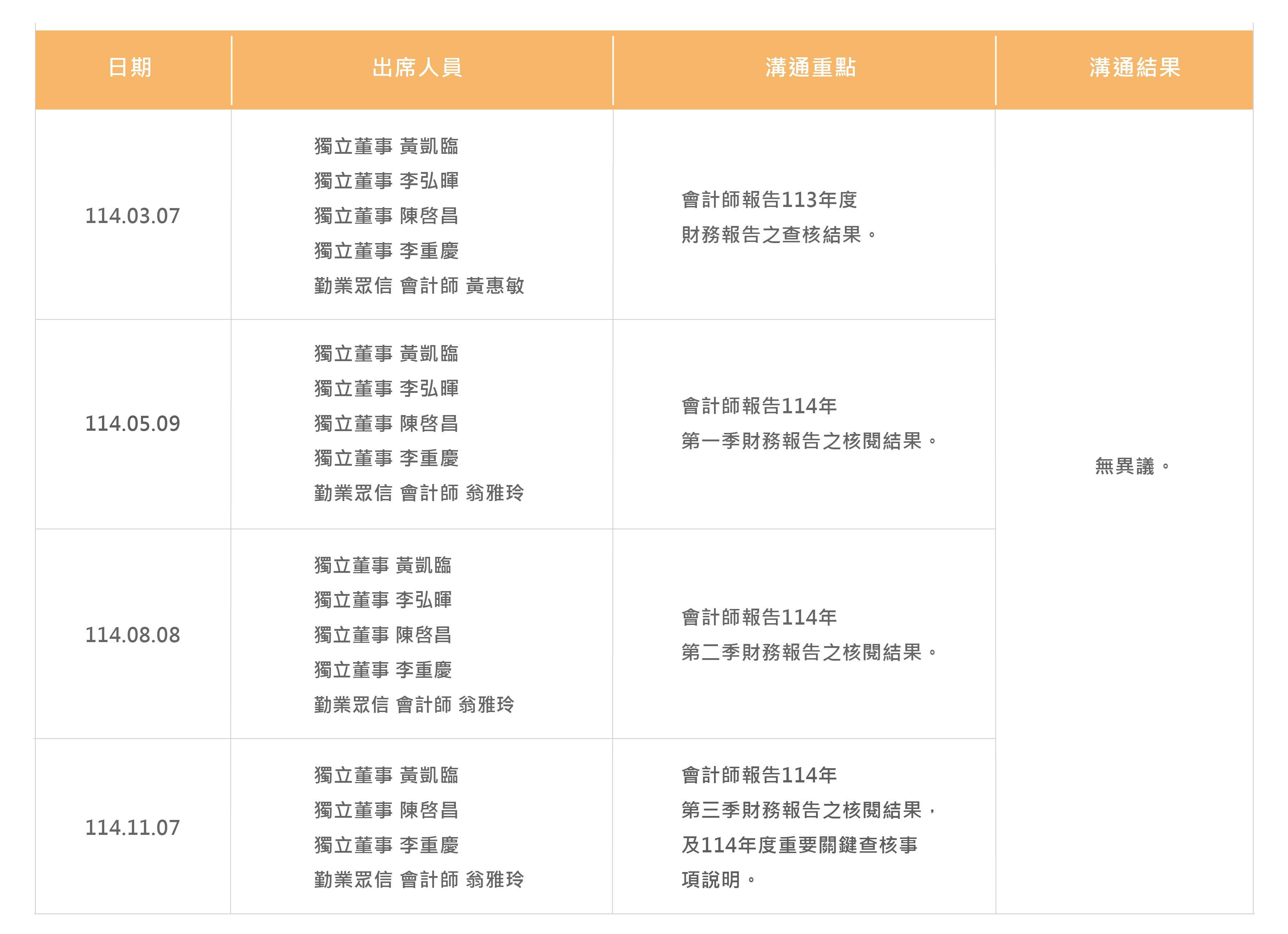 2、114年獨立董事與內部稽核主管溝通情形:溝通情形請詳公司網頁公司治理下之內部稽核說明。