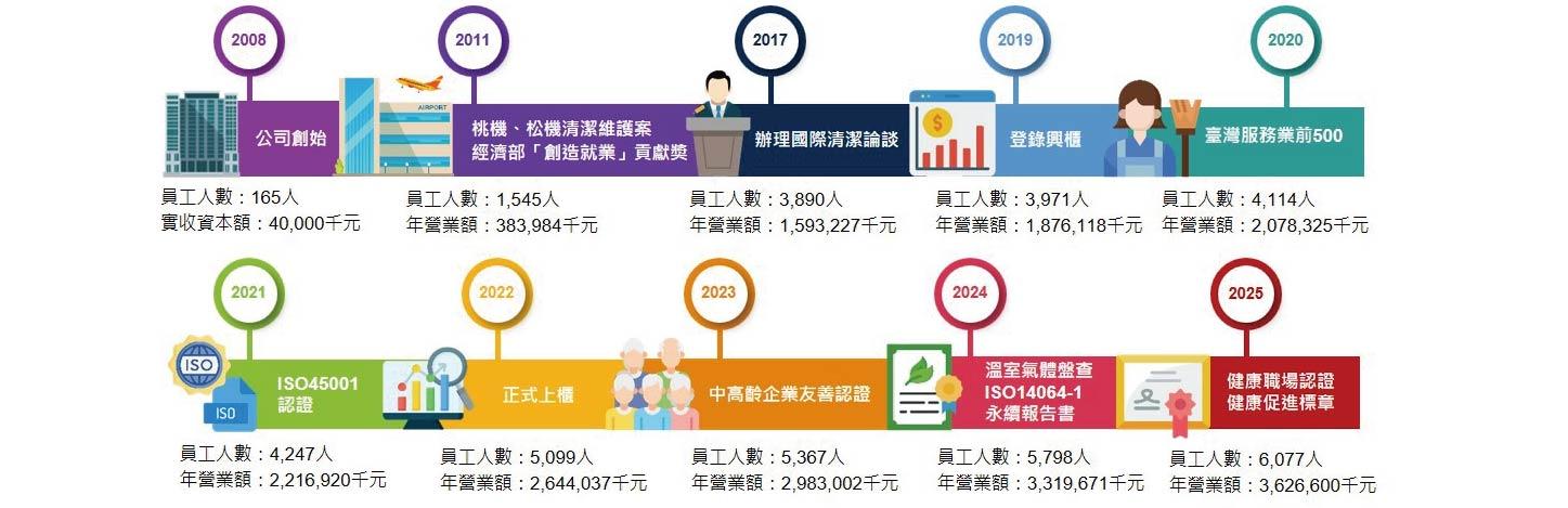 近年,在COVID-19疫情嚴峻的衝擊下,集團本業獲利仍維持穩健成長、繳出亮眼的成績單,並榮獲2021年《天下雜誌》企業調查、服務業年營收排名第468名;除了旺盛的榮景與競爭力持續提升外,更於2018至2023年,獲《勞動部勞動力發展署》頒發進用身心障礙員工–第16、17、19及21屆金展獎;另於2014至2024年間,榮獲《台灣永續關懷協會》九度蟬連誠信廠商、八度獲頒金獅獎認證。