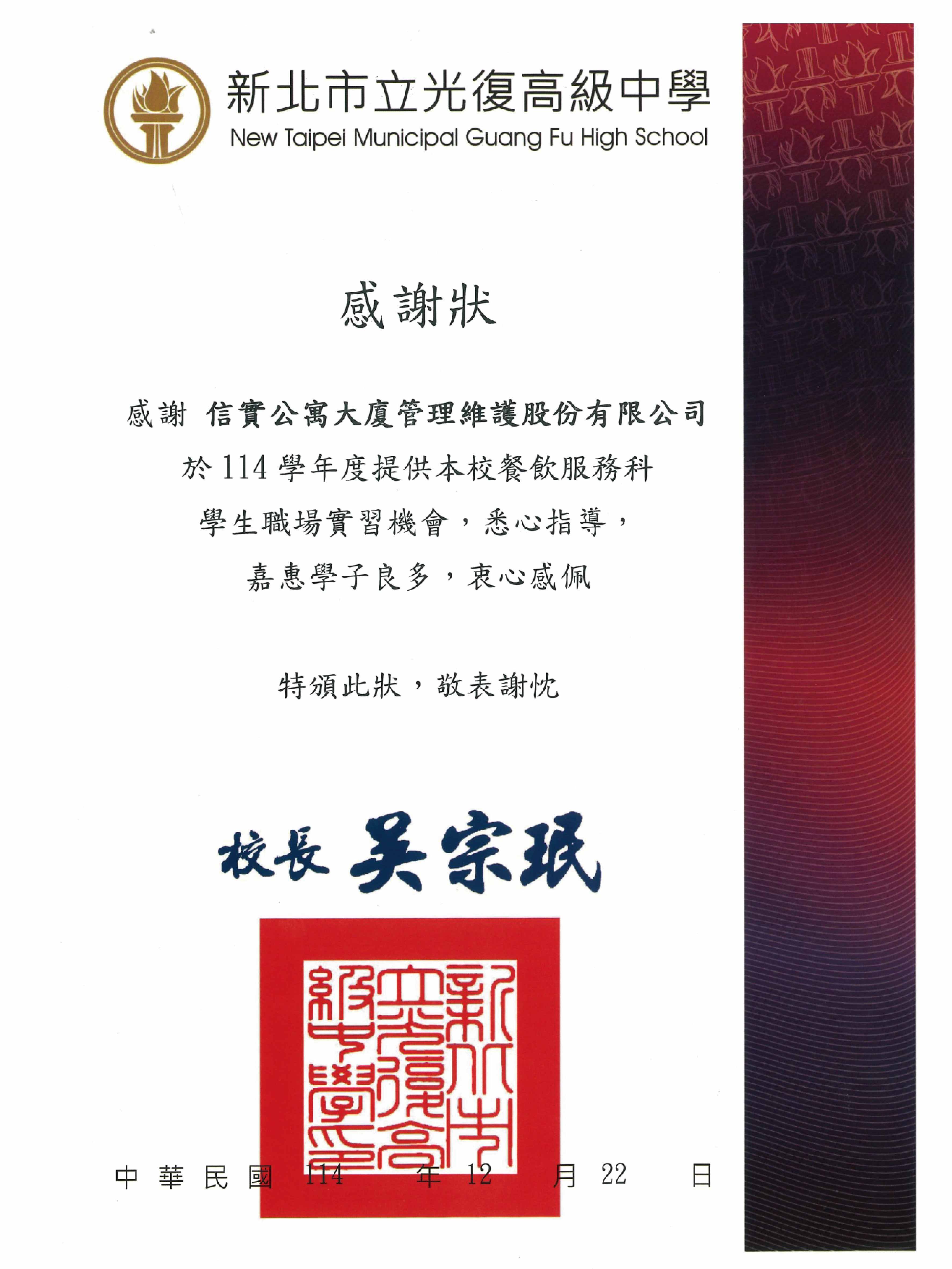 為感謝信實在學生職場學習推動上的支持與付出,新北市立光復高級中學特頒發感謝狀,肯定本公司用心與貢獻。