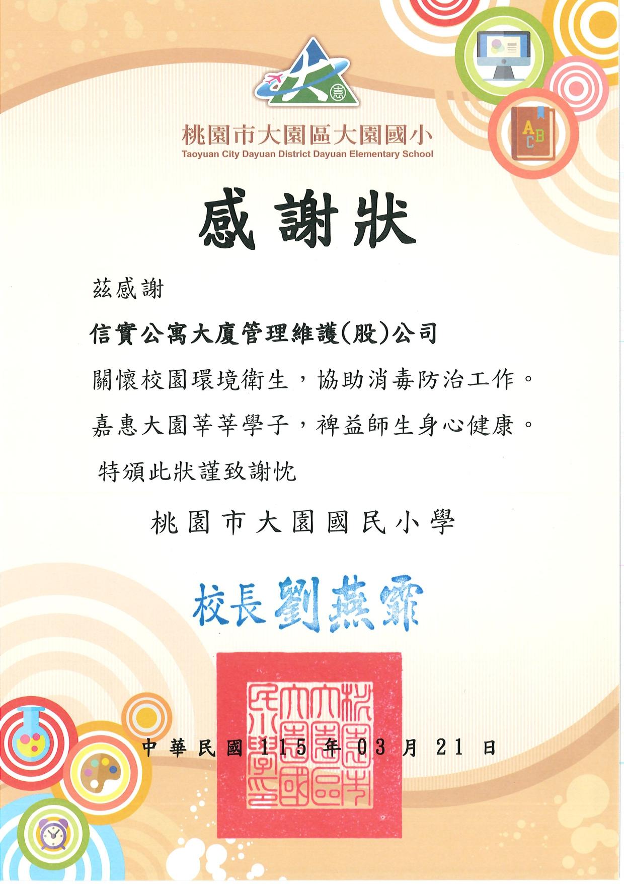 因應桃園市大園國小發生流感群聚情形,本公司於 3 月 21 日前往校園,執行全方位的病媒防治噴藥,協助強化校園整體防疫能量,降低感染風險,維護師生健康與校園安全。本次行動亦獲校方肯定,特頒發感謝狀,以表彰本公司積極投入防疫工作之貢獻。
